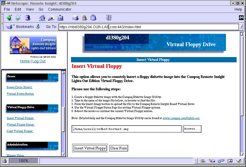 1. Connect to the Remote Insight Lights-Out card of the Linux system from a Java-enabled browser (Netscape, MSIE) using the URL https://XX.XX.XX.XX where the X's are the IP address assigned to the card. You can use a Linux system running Netscape or a Windows system running Netscape or Microsoft Internet Explorer. Just have the redhat-bootnet.img local to the system running the browser. Note that this special image file is larger than a regular 1.44MB floppy. Note: You may want to use FTP to move the file to the system that you will run the browser on.