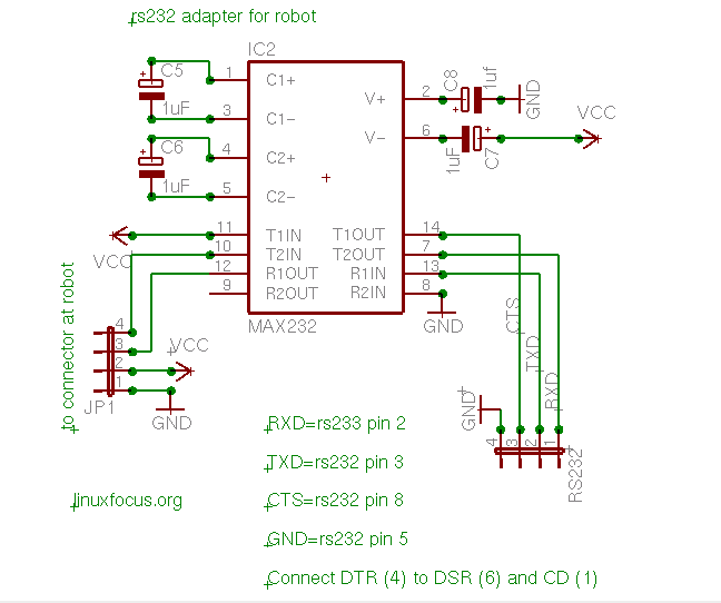 Ahora el circuito para nuestro robot autónomo estaría listo. Sin embargo, ¿qué harías si el robot no funcionara como esperabas porque algo está mal con el software? No puedes ver nada. No sabes cúales son los valores de los sensores a la luz, no sabes porqué el software del robot ha tomado tal o cual decisión. Lo que necesitamos es algún tipo de salida (output) en la pantalla que nos permita mostrar y entender qué hace el robot. El puerto serial RS232 es muy útil para este propósito. Podemos imprimir los valores de las variables y hasta podemos comunicarnos con el robot. No deseamos conectarlo todo el tiempo pero lo necesitamos para depurar al robot. Por esto tiene sentido colocar el max232 y otras piezas necesarias para la conexión RS232 en una tabla aparte y conectarla, solamente cuando sea necesario: