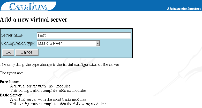 In this section, I will give you a step-by-step tutorial on how to create your first site (virtual server) with Caudium. If you want to do something useful with Caudium, you have to create at least one virtual server. Without this first server, Caudium will not do anything. If you use your browser to access your server, you will only get a dialog box prompting for the CIF. login/password.