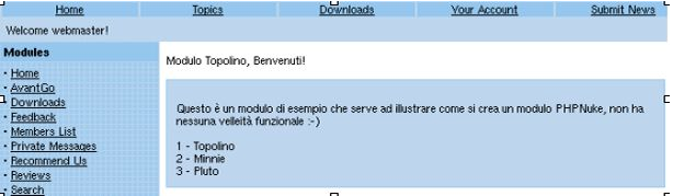 Important: Before making anything it's necessary to create a folder called "modules/Topolino", the file we have just created (with the other contents) must be called index.php and must stay in that folder.
