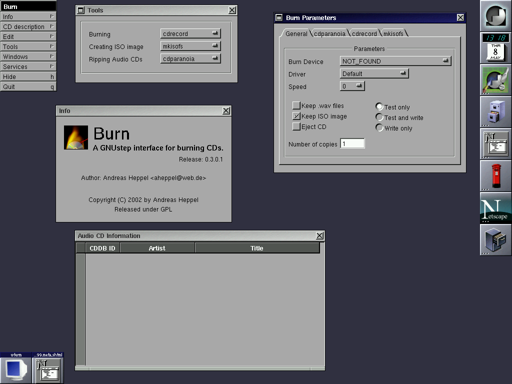 Como el nombre puede decirle, esta es una aplicación para quemar CDs. Burn.app es el trabajo de Andreas Heppel y puede obtenerlo en http://www.sourceforge.net/projects/gsburn. (gsburn es el nombre de las versiones previas). La versión probada es la 0.3.0.1.
