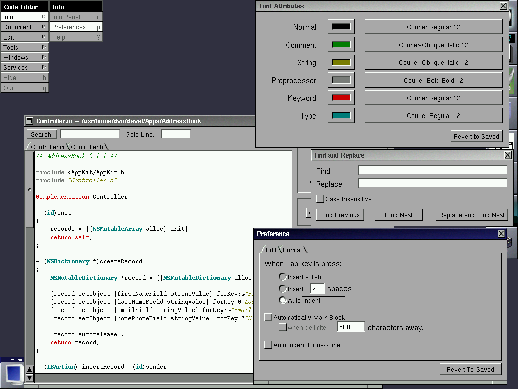 CodeEditor le proporciona un resaltado de sintáxis (por medio de colores). Una original y útil característica viene de la habilidad de usar lengüetas. Esto le permite tener diferente código fuente en la misma ventana (por ejemplo, los archivos *.m y *.h). Usando la barra de herramientas, puede buscar a través del código o ir a una línea específica. Por supuesto, existe también un "encontrar y reemplazar" disponible desde el menú herramientas con soporte a expresiones regulares.