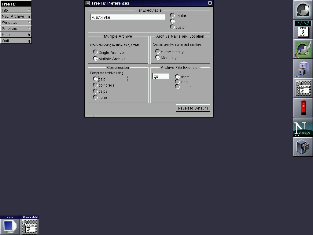 FreeTar trabaja de manera oculta (es decir, no le proporciona ventana alguna). Usted presiona el botón derecho de su icono (ya sea en el clip o en el dock cuando está usando Window Maker) para desplegar un menú para seleccionar el o los archivos que va a archivar.
