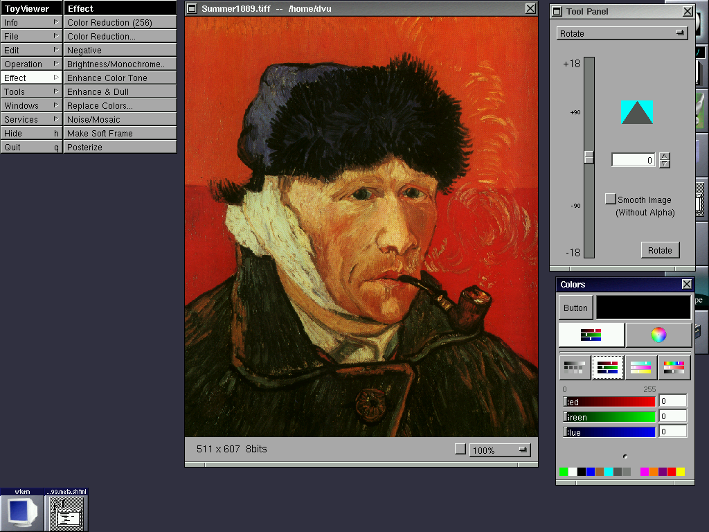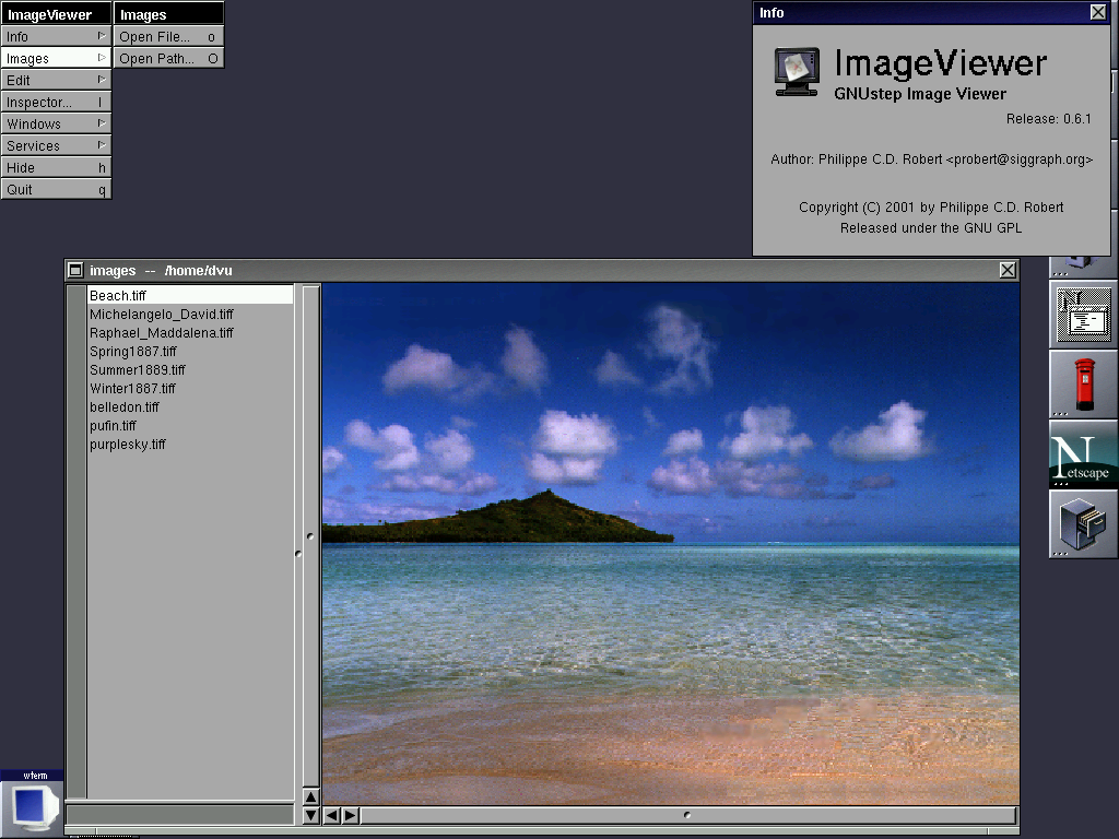 ImageViewer es el trabajo de Philippe C.D Robert (con la colaboración de Pierre-Yves Rivaille y Rob Burns). La versión usada para esta prueba es la 0.6.1 Philippe es el autor de varias aplicaciones GNUstep, entre las cuales usted puede encontrar el grandioso ProjectCenter. Puede descargar ImageViewer en http://www.nice.ch/~phip/softcorner.html