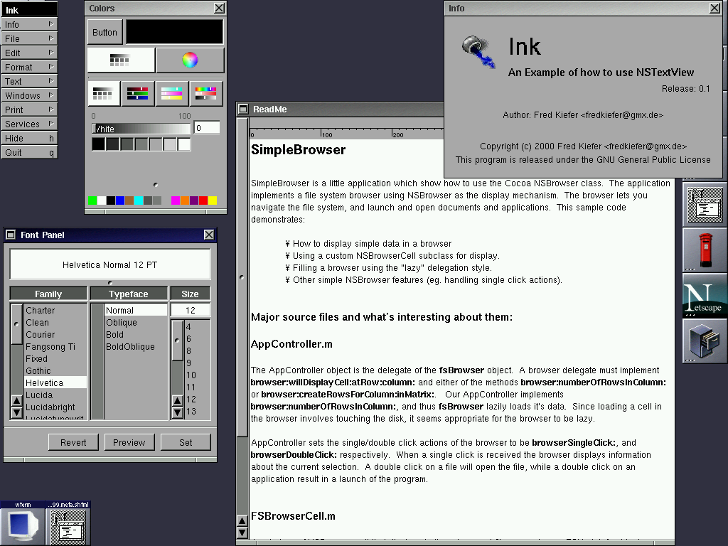 Una vez más, el nombre lo dice todo. NeXTstep es usado para proporcionar el mejor sistema ayuda en línea hasta ahora. Y yo aún no entiendo por qué Apple lo reemplazó por la "Apple Help" en Mac OS X. ¡Pero no importa!, HelpViewer es un clon del NeXT HelpViewer. La última versión es la 0.3.0 y es el trabajo de Nicolas Roard. Nicolas es también autor de Waiho, formalmente conocido como un GSFtp, un cliente FTP para GNUstep. Puede descargar HelpViewer desde http://www.roard.com/helpviewer/