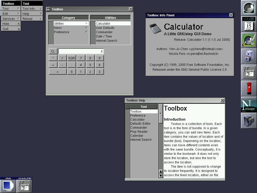 Toolbox, es una colección de herramientas. Este es el trabajo de Yen-Ju Chen con la colaboración de muchos otros desarrolladores de GNUstep, de acuerdo a las herramientas (GNUstep es una familia). Puede descargar esta aplicación en http://savannah.nongnu.org/projects/toolbox
