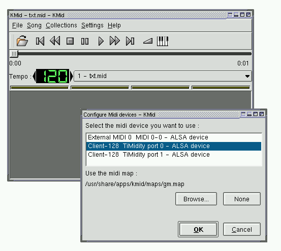 También hay programas parecidos a timidity (timidity -ig ejecutará el GUI gtk) o kmidi (no kmid) los cuales ya incluyen el sintetizador midi en software. En estos casos no necesitas capacidas internas midi en el núcleo, sea soportadas por hardware o emuladas en el software timidity. Sin embargo, en general es mejor tener una api común midi que re-implementar un sintetizador midi en cada software.